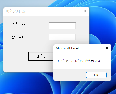 一致している時はEXCELファイルを表示してユーザーフォームを非表示にする。一致していなければメッセージボックスを表示させ、テキストボックスをクリアします。