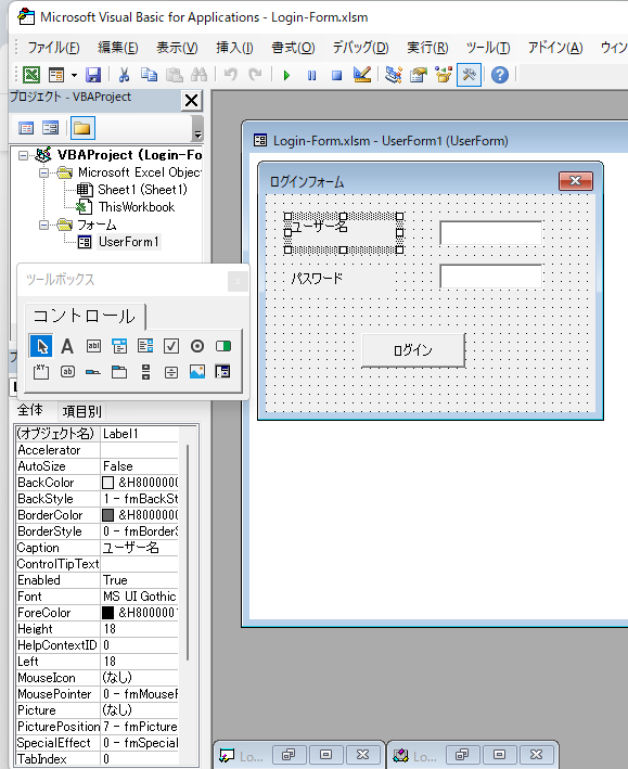ラベルのプロパティにはCaptionを変更してユーザーフォームの表示を変える。1つ目のラベルへユーザー名、2つ目にラベルにパスワードをCaptionへ入れると表示変わる。