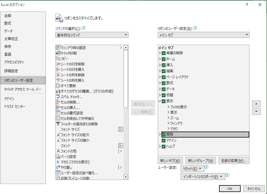 開発メニューが表示されない時、EXCELオプションからリボンユーザー設定にある開発にチェックする。エクセルに開発が表示されたらVisial Basicが表示する