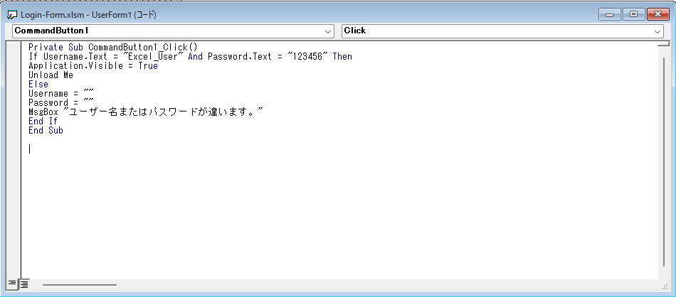 テキストボックスのオブジェクト名UserNameへの値がExcel_User かつオブジェクト名Passwordが123456であるかをIF文で判定します。