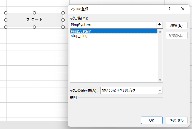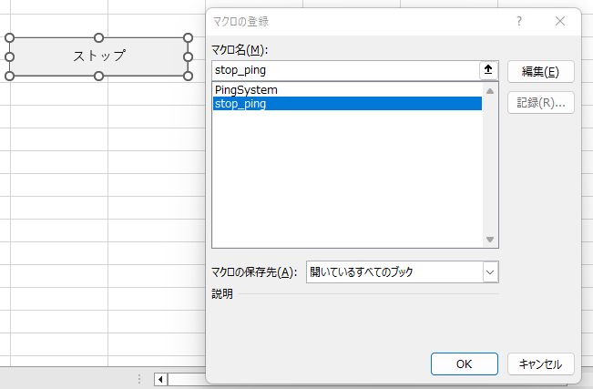 - シートにフォームコントロールボタンを挿入して名前変更STOPに変更したボタンにマクロ(stop_ping)を登録する